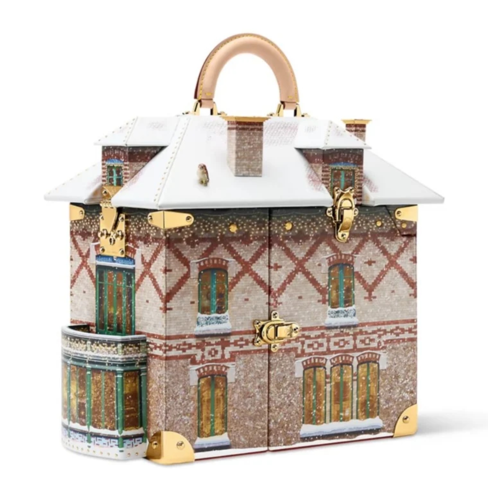 تُترجم الحقيبة هذا الإلهام إلى تصميم هندسي دقيق، إذ صُنعت جدرانها من جلد متين يمنحها مظهر الحجر، بينما جاء السقف بألوان دافئة تحاكي لون الطين التقليدي. أما النوافذ، فقد نُفذت بدقة متناهية وأُحيطت بإطارات معدنية ذهبية مستوحاة من الحرفية الفرنسية الكلاسيكية.