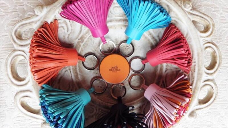 ومن شعارات هيرميس الشهيرة حلقة مفاتيح كارمن. وهي عبارة عن حلقات مصنوعة من شرابات لطيفة يمكنك إضافتها إلى حقيبتك. حلقات كارمن تأتي بألوان مختلفة تناسب لون حقيبتك.