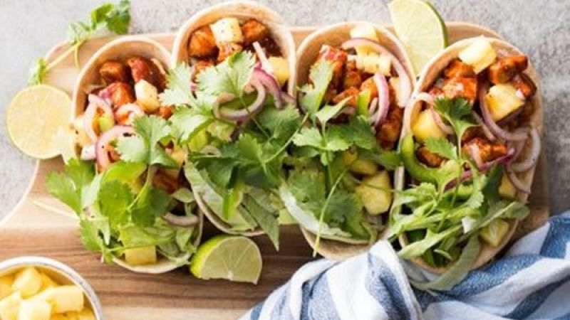 يقدم الدجاج والسلطة مع التاكو والكزبرة وانصاف الليمون الإضافية.