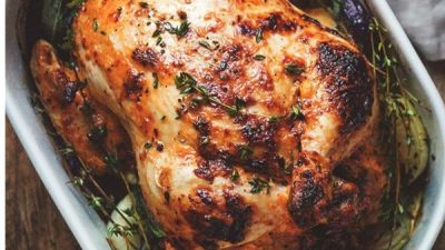 يوضع نصف رأس الثوم ، والزعتر ، ونصف البصل في الجزء السفلي من الصينية وتوضع فوقه الدجاجة. يضاف نصفين من البصل ، نصفين من رأس الثوم ، المريمية ، والزعتر إلى الدجاج. تضاف بعض الخضار حول الدجاج. تدهن الدجاجة بسخاء بالصلصة البيضاء وترش الأعشاب والمزيد من الفلفل الأسود.