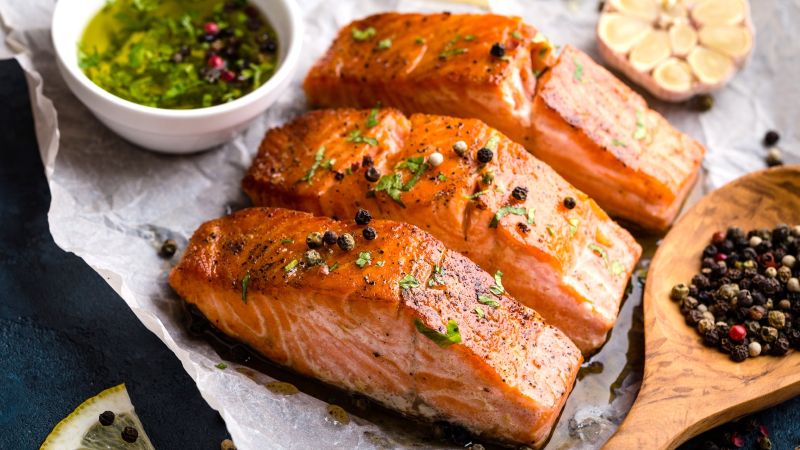 يُعتبر السلمون المشوي بالفرن من أشهى وأسهل الأطباق البحرية التي تجمع بين الطعم اللذيذ والفوائد الصحية العديدة، يحتوي على البروتينات والأحماض الدهنية أوميغا-3 التي تدعم صحة القلب والدماغ، جرّب وصفة السلمون المشوي بالفرن، بتتبيلة بسيطة من الأعشاب وزيت الزيتون يقدم مع خضار مشوية أو سلطة الخضار لإعداد وجبة مثالية وصحية مغذية: