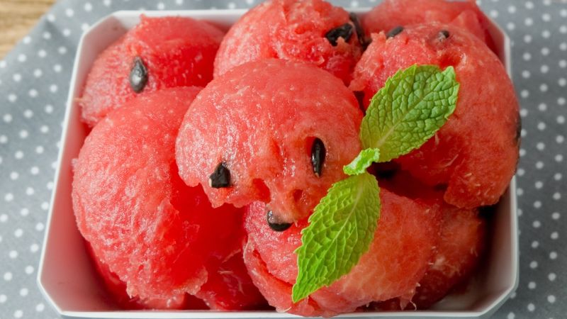 - ضع قطع البطيخ في الثلاجة مدة 4-5 ساعات حتى يتجمد جيداً