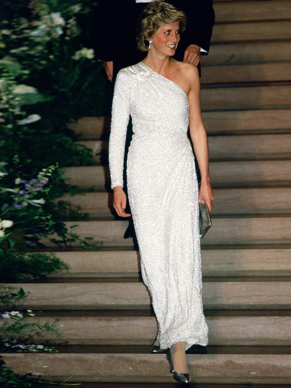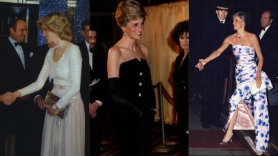 هي الأميرة الأكثر أناقة على مر التاريخ فلم يسبق لأي فرد من عائلة ملكية بأن يطل بمثل أناقة وجرأة الأميرة ديانا بإطلالاتها من قبل، فاستطاعت أن تأسر قلوب محبيها ومحبي عالم الموضة على وجه الخصوص بحضورها وذوقها الرفيع بشكل دائم، وإحدى أجمل الإطلالات التي أطلت بها الأميرة ديانا من تصميم "كاثرين ووكر" باللون الوردي الـ"باستيل" الراقي بقماش الـ"جورجيت الأنيق الذي شكل هيكل التنورة الأنيقة، والتي اعتلاها تصميم بالحرير الأبيض الراقي الذي أكمل أناقة الفستان الجذاب. ونسقته مع حذاء بكعب بنفس درجة اللون الوردي.