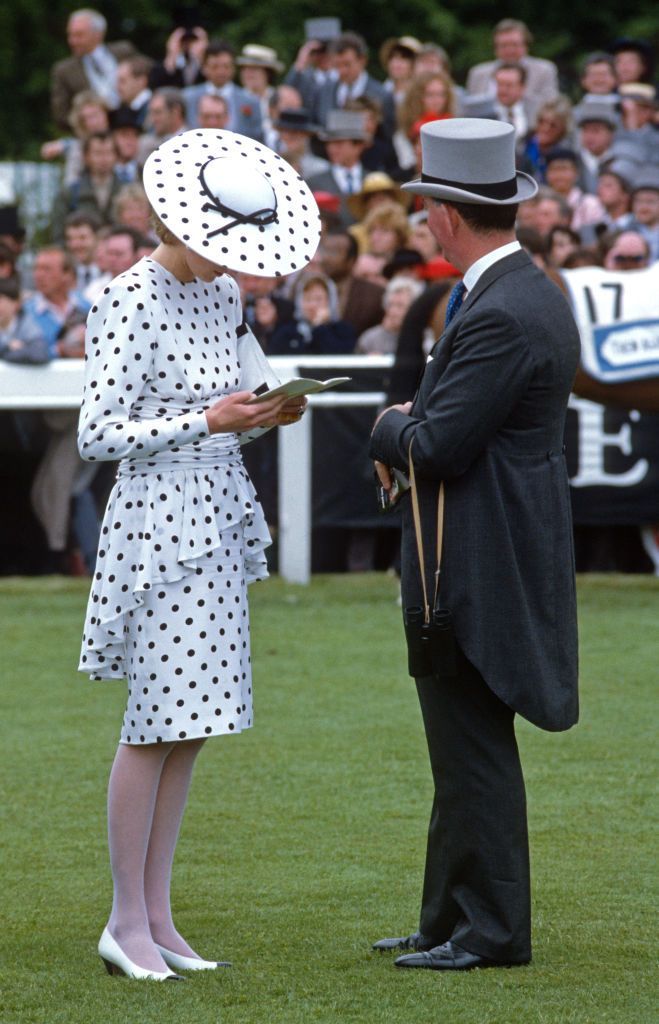 كما تألقت الأميرة ديانا في ديربي إبسوم، يونيو 1986 بفستان منقط من "فيكتور إيدلستين" باللونين الأبيض والأسود وقبعة من فريدريك فوكس.