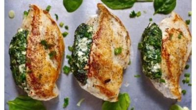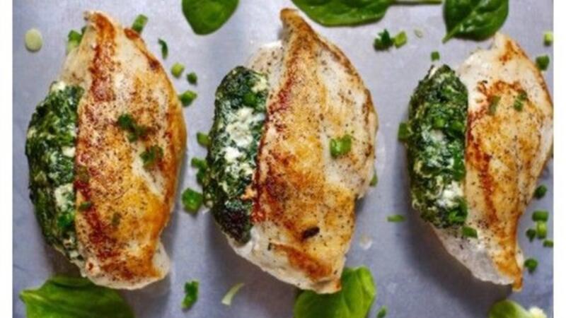 تغرف ملعقة من خليط السبانخ على كل صدر دجاج. تلف وتأمن بعود خشبي.