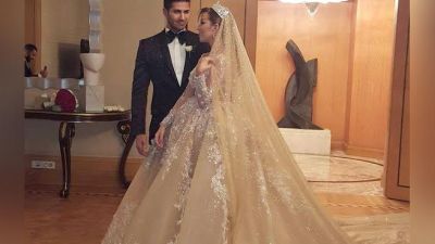 ارتدت العروس إنجي قصابية فستان زفاف ساحر باللون الأيفوري من تصميم نديم أوليفيرا لبوتيك لابورجوازي الفاخر، والأمر اللافت في الموضوع أن فستان العروس مرصع كامله بالألماس البراق ولتكتمل إطلالتها الملكية ارتدت تاج كبير مع طرحة طويلة.