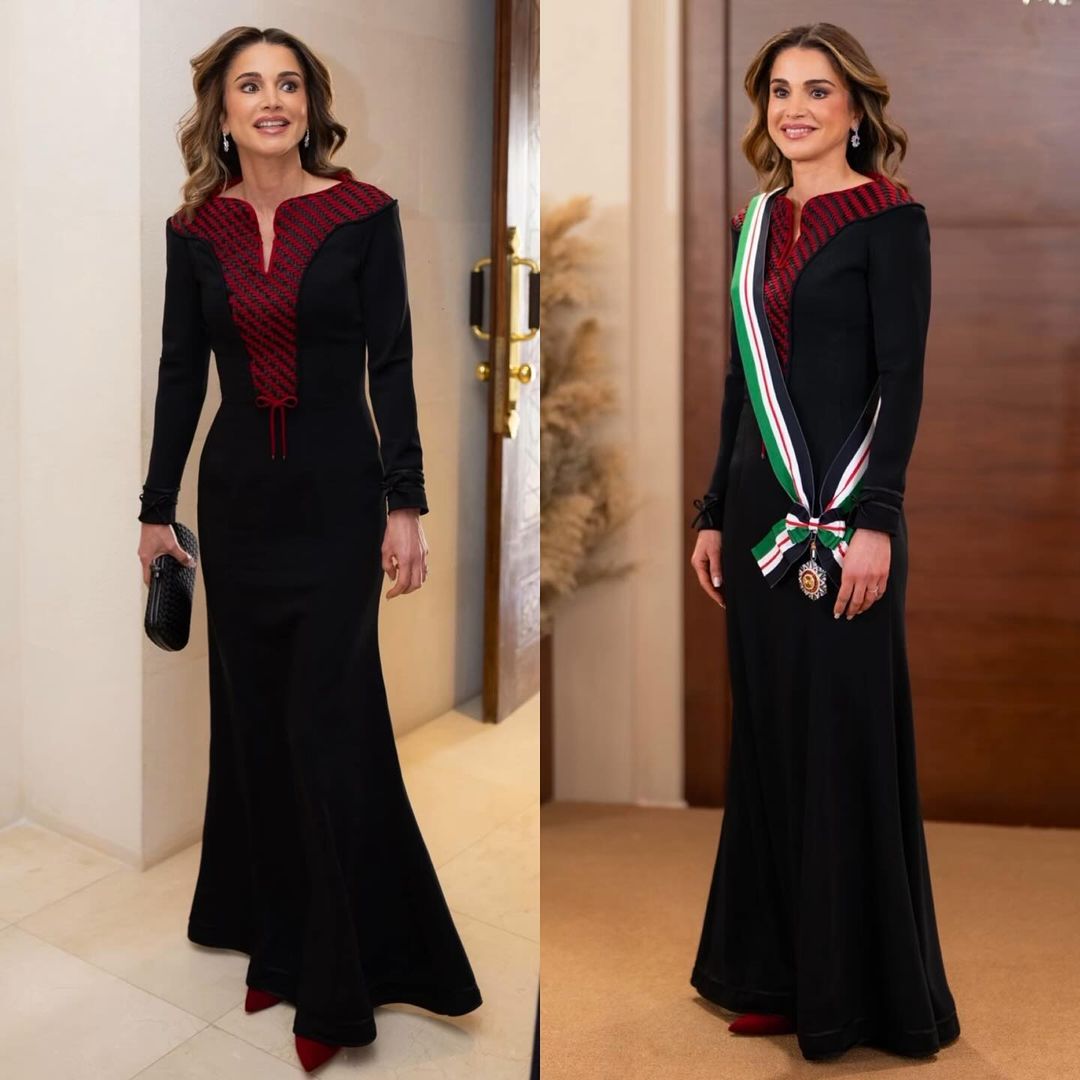 أطلت الملكة رانيا العبدالله بإطلالة خاطفة وراقية للغاية أثناء تقلدها وسام اليوبيل الفضل بمناسبة مرور 25 عام على حجم جلالة الملك عبدالله الثاني بن الحسين، وقد بدت أنيقة بفستان مميز باللون الأسود الملكي بالكامل وبقصة مجسمة أبرزت رشاقتها وقوامها. حيث أتى فستانها مميزا من الأعلى بتفاصيل راقية على الياقة باللونين الأحمر والأسود والأنيقان وانتهت تفاصيل الياقة والصدر بربطة "فيونكة" صغيرة ومميزة.