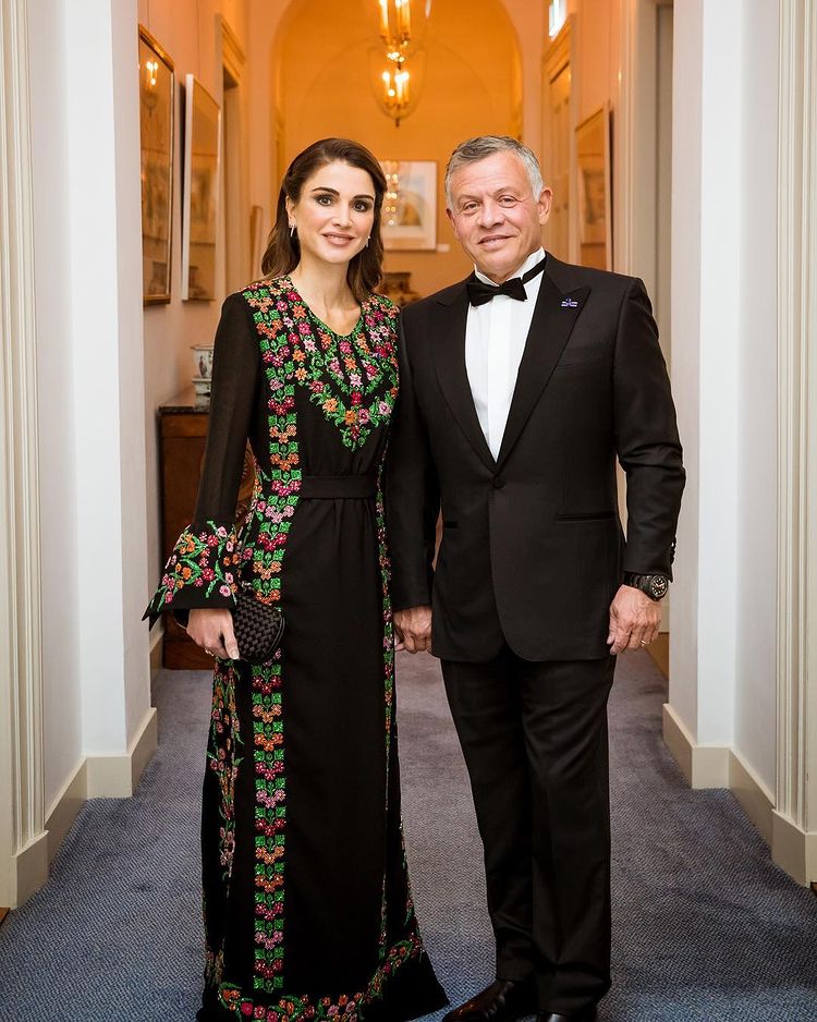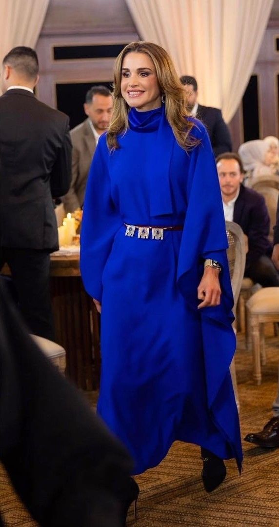 حيث جاءت إطلالة الملكة من دار " نوال فرح فريحات"، وتميزت باللون الأزرق ال"إنديغو" الغامق، والذي تميز بمجموعة التطاريز الراقية والأنيقة التي زينت التصميم بالكامل، بدءا من الياقة ووصولا الى التنورة والأكمام، وزينت ثوبها هذا بحزام ذهبي عريض عند الخصر حدد قوامها بكل أناقة وأبرز ر شاقتها، ونسقت معه حقيبة يد من توقيع "بوتيغا فينيتا" (Bottega Veneta).