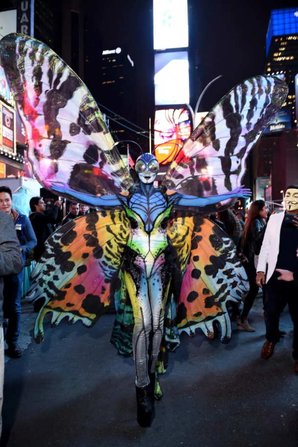 تحولت عارضة الأزياء الشهيرة إلى فراشة عملاقة ، وتجولت في ال"تايمز سكوير" ببدلة جسم بألوان قوس قزح، بما في ذلك الأجنحة وطلاء الجسم لتبدو فراشة جنونية في حفل الهالوين لعام 2014.
