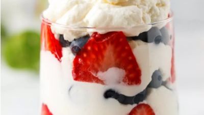 يُسكَب خليط الجبنة الكريمي في أكواب فردية ويوضع فوقها التوت والفراولة. يبرد ويقدم على الفور.