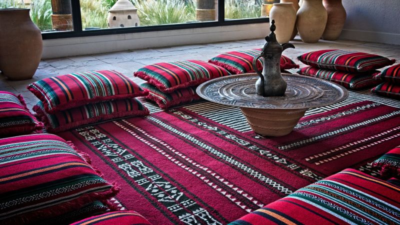 - استخدام الأقمشة المطرزة يدويًا: مثل الكليم العماني والقطع المطرزة بألوان زاهية تُوضع على الأرائك أو الجدران.