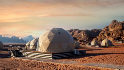 وادي رم والتي تقع في جنوب المملكة الأردنية الهاشمية واحدة من أجمل المناطق السياحية في الأردن، منطقة لها طابع وسحر خاص والملقبة بوادي القمر نظراً لتشابه تضاريسها مع تضاريس القمر، وفي هذا المكان سوف تجد خيام صممت على شكل قباب لتتيح لنزلائه تجربة مميزة تقاربهم أكثر من البيئة الطبيعية للمنطقة.