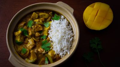 البوابة - الدجاج مع المانجو وصفة آسيوية مشرقة وحيوية ولذيذة سيستمتع بها جميع أفراد العائلة! يتم تحمير قطع الدجاج الطرية ثم خبزها في صلصة المانجو الحلوة والمنعشة. يقدم مع الأرز لامتصاص كل الصلصة اللذيذة!