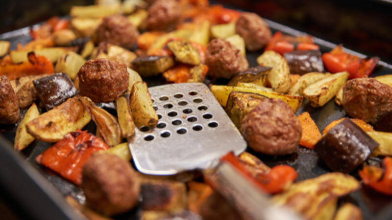 - نُخرج الصينية من الفرن ونضع كرات اللحم بين قطع البطاطا، نسكب 2 ملاعق مياه إلى المرطبان الذي يحوي الكمية المتبقية من الصلصة، نخلط جيدا ونسكب القليل منه على كل كرة لحم، نعيد الصينية الى الفرن، نخفض درجة الحرارة الى 170 درجة مئوية ونتركهم لمدة 20 دقيقة.