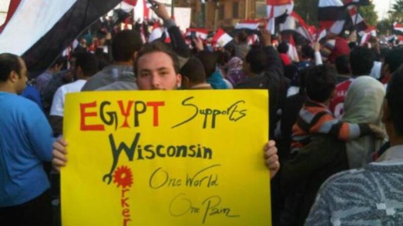 "مظاهرات مصر ألهمت نقابات العمال في ولاية ويسكونسن الأمريكية وتطالب برحيل حاكم الولاية الجمهوري سكوت واكر على غرار رحيل حسني مبارك"، ونشاهد مجموعة من الصور من ضمنها صورة لمصري يرفع لافتة يتضامن فيها مع عمال أمريكا!!.