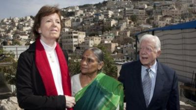 وكان الوفد الذي يضم الرئيس الاميركي السابق جيمي كارتر والرئيسة الايرلندية السابقة ماري روبنسون والمناضلة الهندية في سبيل حقوق المراة ايلا بهاتن وصل الى رام الله الاربعاء اتيا من عمان بعد محطات في غزة والقاهرة ودمشق.