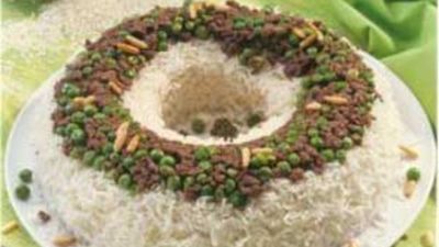 · وزعي خليط اللحم والبازيلا فوق الأرز، غطي القدر باحكام، اتركيه على نار هادئة ٢٥-۳۰ دقيقة الى ان ينضج.