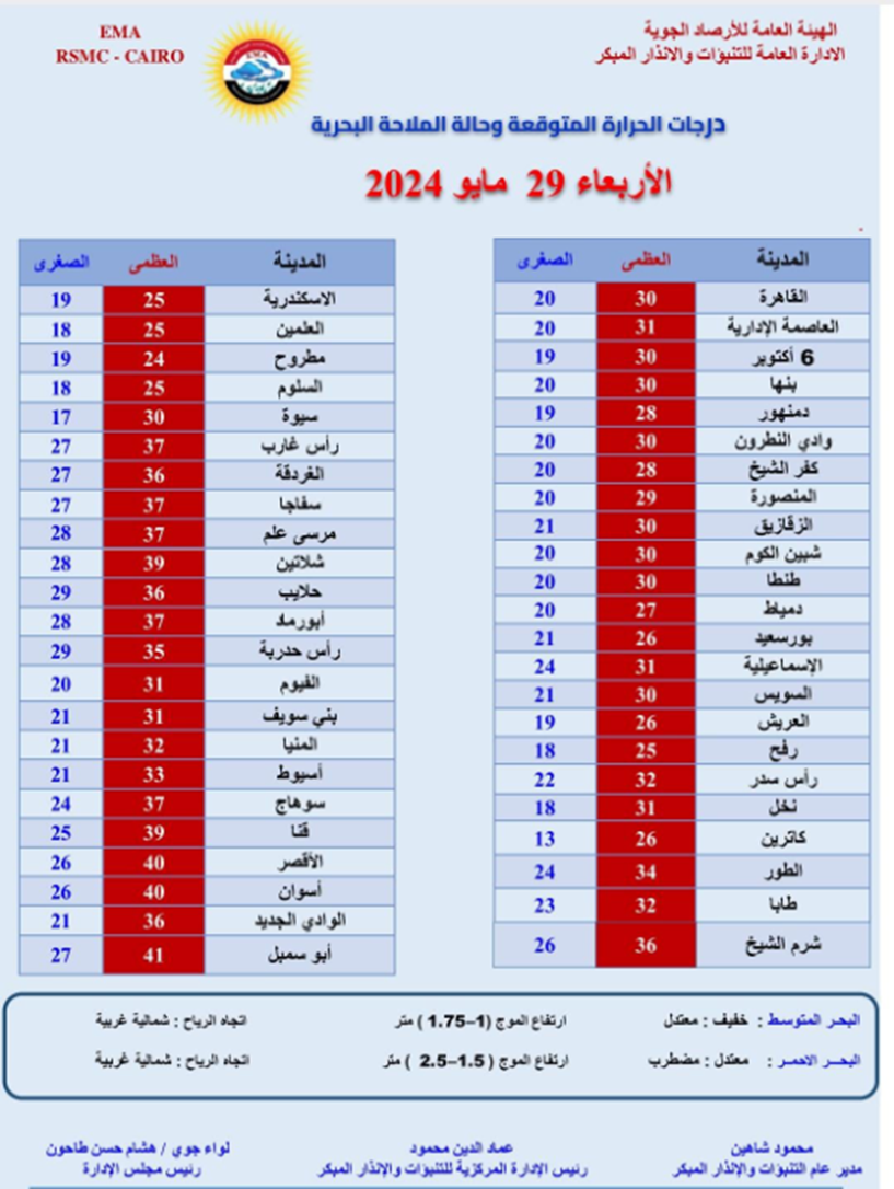 قامت الهيئة العامة للأرصاد الجوية المصرية بمشاركة سلسلة من البيانات الخاصة بحالة الطقس اليوم في مصر بمختلف المدن؛ وهي ما أشارت من خلالها إلى أن الموجة الحارة قد انكسرت فعليًا بالأمس ولا تزال منكسرة إلى اليوم الأربعاء 29 مايو 2024.