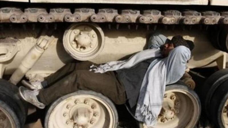 متظاهر في ميدان التحرير يستلقي على عجلات دبابة