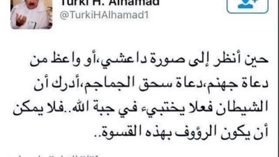 — بدر العياضي (@bdr9090) December 30, 2015#تركي_الحمد_يتطاول_علي_الله فعندما تصدى له الصالحون خاف فاعتذر فتذكرت قول الله "لأنتم أشد رهبة في صدورهم من الله" pic.twitter.com/n6OkPKevl2