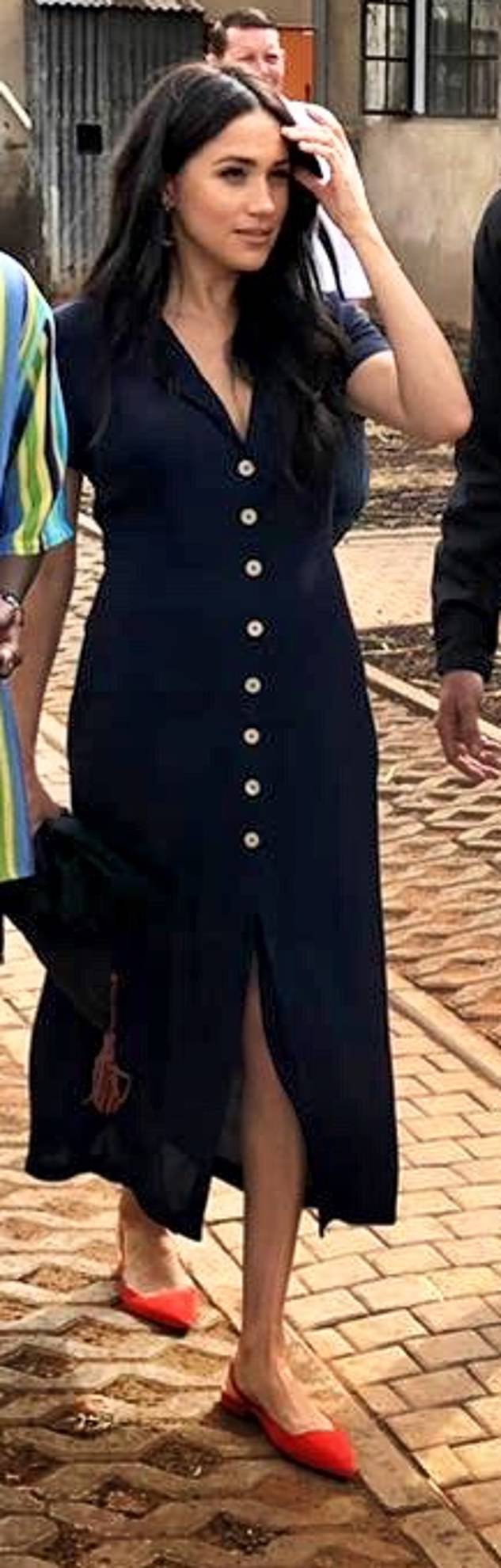 ارتدت ميغان فستان قميص باللون الأزرق الليلي من مجموعة Aritzia وبقيمة 148 دولار، وبطول ماكسي وتزيّن بفتحة أمامية وياقة على شكل V كما نسّقت معه حذاء مسطح باللون الأحمر والبالغ سعره 129 جنيه أسترليني من مجموعة Everlane.