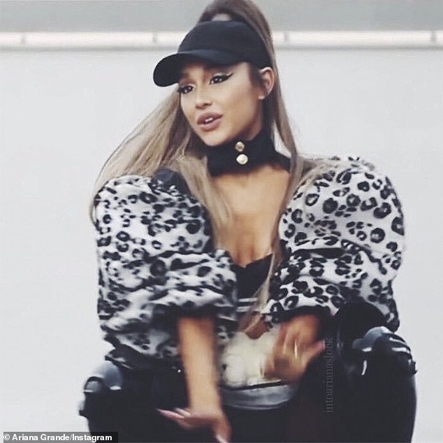 ارتدت أريانا حمالة صدر وردية نسقتها مع تنورة جلدية قصيرة بنفس اللون كشفت عن رشاقة ساقيها، كما ارتدت حذاء لافتًا ذا كورتي ريش ضخمة.