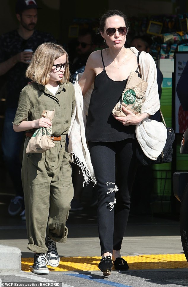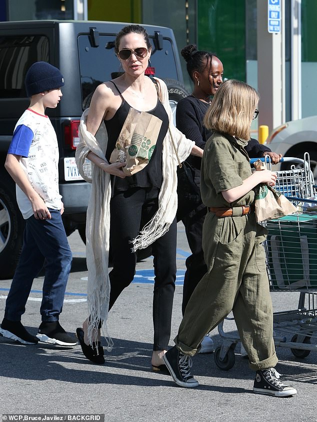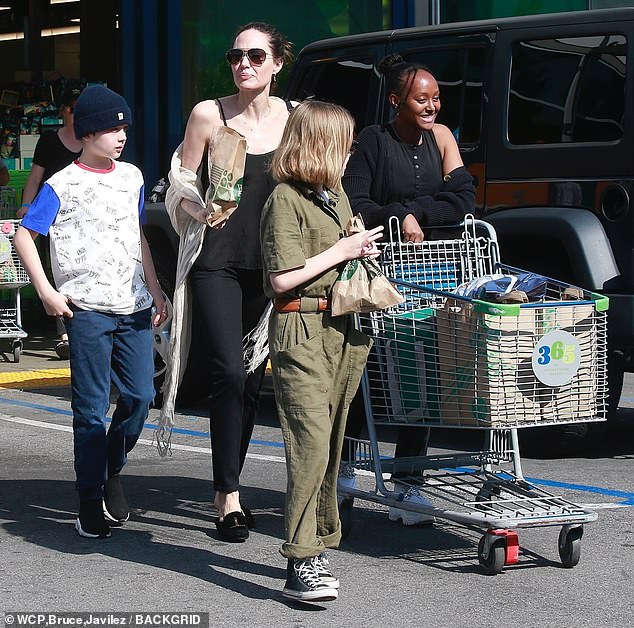 أما ابنتها زهارا، فقد كانت بإطلالة سوداء بينما كانت تدفع عربة التسوق، وانضم إليهما نوكس ببنطاله الأزرق وبلوزة بيضاء، وفيفيان بجمبسوت كاكي مع حزام بني اللون.