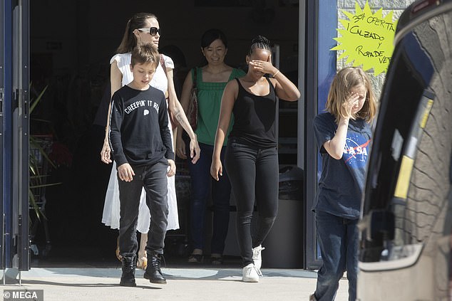 أنجلينا جولي تبدو حيوية وجميلة أثناء تسوقها مع أولادها بجزيرة إسبانية