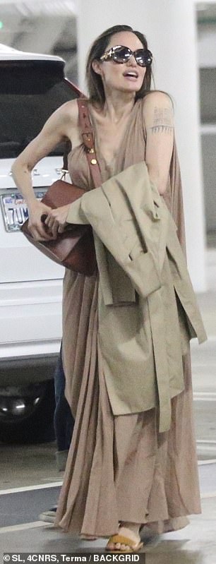 واعتمدت أنجلينا إطلالتها المعتادة التي تظهر بها مع أطفالها أثناء التنزه أو التسوّق، فقد ارتدت فستاناً فضفاضاً باللون البيج، نسّقته مع حذاء مسطح وحقيبة يد، كما حملت معطفها على يديها.