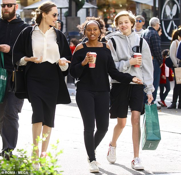 وخرجت أنجلينا يوم أمس الأحد للتسوق برفقة ابنتيها زهارا وشيلوه حيث اختارت إطلالة انيقة تتناسب مع الجو البارد في لوس أنجلوس فارتدت قميص أبيض مع تنورة سوداء يبلغ طولها حد الركبة كما نسّقت فوقهم جاكيت من الصوف الأسود.
