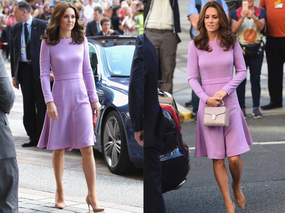 بدت كيت في غاية الأناقة والنعومة بذلك الفستان البسيط الذي تميز بلونه الأرجواني من تصميم "إميليا ويكستيد"، والذي ارتدته في 2017 ومرة أخرى في 2018، ولكن مع اختلاف حقيبة الكلاتش.