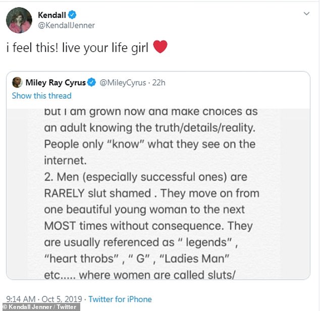 في تغريدة أشارت "مايلي" أن الرجال دائمًا ما ينجون بفعلتهم، وكتبت: "الرجال وخاصة الناجحين منهم نادرًا ما يطلق عليهم لقب "عاهر"، فهم ينتقلون من امرأة يافعة إلى الأخرى دون عواقب، فهم غالبًا يوصفون بالأساطير، والمحببين، وزير نساء، بينما النساء يطلق عليهم "عاهرة".. أنا فقط أحاول النجاة في عالم الرجال، في حال لم يكن بمقدورنا التغلب عليهم."