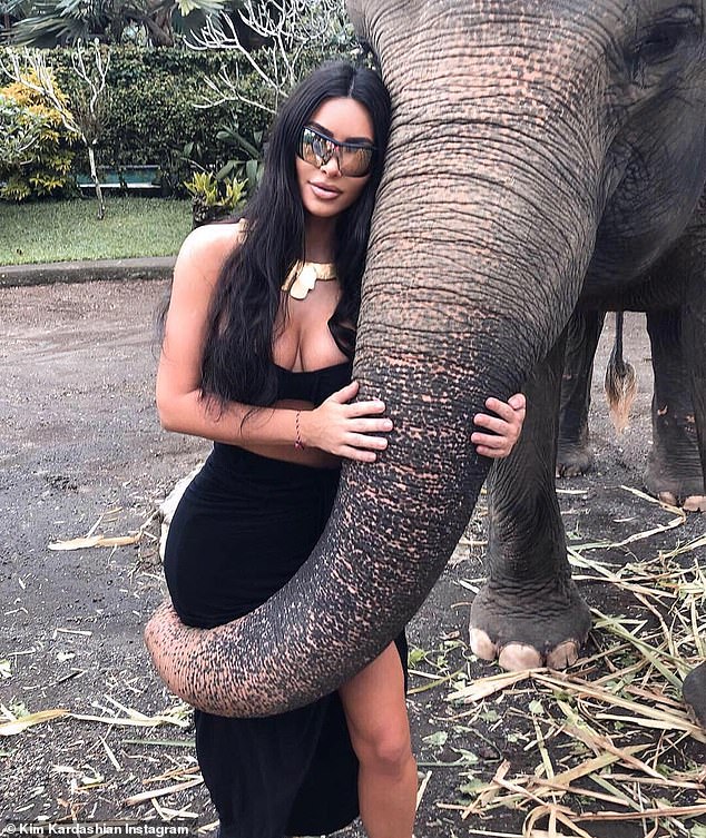الفيل يحتضن كيم كارداشيان بخرطومه.. ومُناصرو الطبيعة يُهاجمونها!