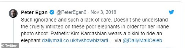 وتأتي هذه الصور بعد خمسة أشهر من انتقادها لتصويرها الفيل وركوبها عليه أثناء رحلتها، حيث غرّد الممثل "بيتر إيغان" عبر حسابه الخاص بمنشور مضحك: "هذا يعتبر جهلًا ونقص رعاية، ألا تعلم كيم كارداشيان كمية القسوة التي تعرضت لها هذه الفيلة المسكينة من أجل التقاط هذه الصورة، إنها مثيرة للشفقة، ترتدي البيكيني لركوب الفيل".