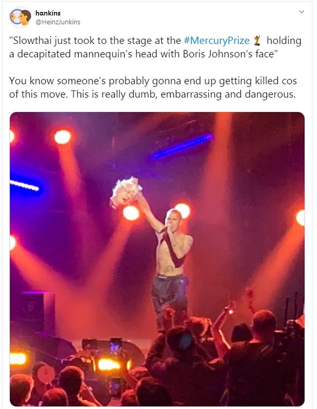 وكان المغني المرشح للجائزة يرتدي تي شيرت يحمل إهانة وسب لجونسون وعليها صورته، وحمل الرأس على خشبة المسرح في لندن.