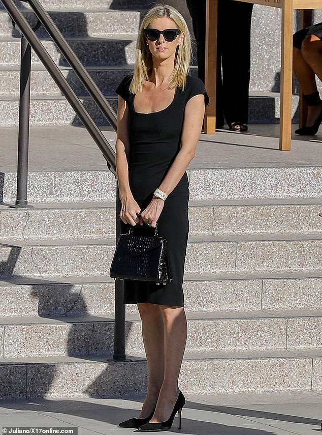 أما نيكي فكانت بنفس مستوى أناقة شقيقتها بالإطلالة السوداء إلا أنها ارتدت فستاناً ضيّق يبلغ طوله حد الركبة نسّقته مع حذاء بكعب عال وحقيبة يد ونظارة شمسية.