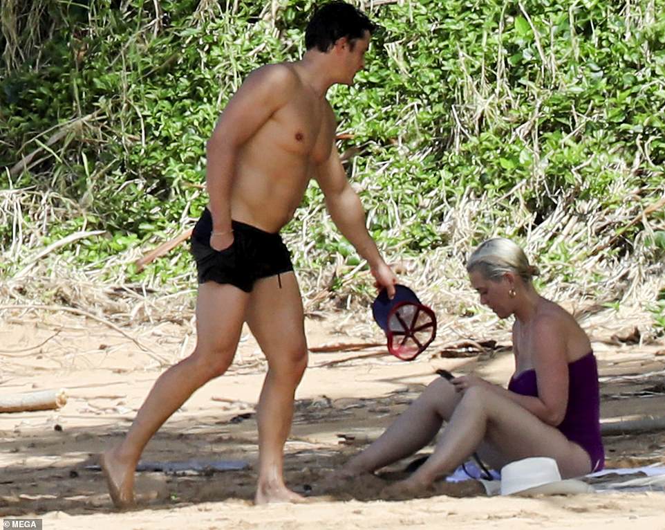 وقد انضم إليها خطيبها أورلاندو الذي أطل دون ارتداء تيشيرت نسَّقه بشورت أسود قصير وبينما وضع على كاتي شرشف وقبعة لحمايتها من الشمس.