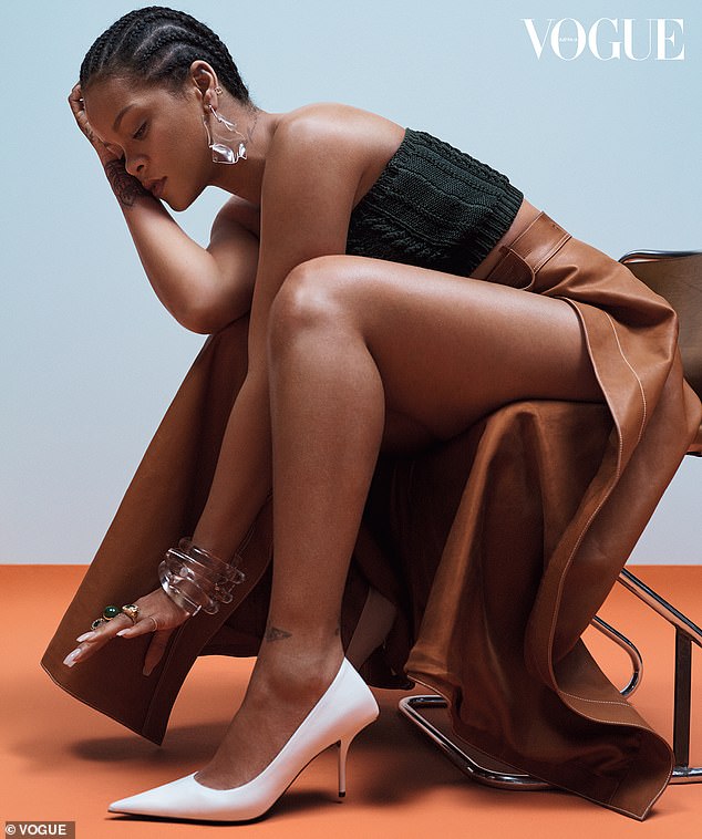 وفي إحدى الصور، تجلس "ريهانا" على حافة كرسي مُرتديةً توب سترابلس من الصوف، نسَّقته بتنورة جلدية ذات خصر عالٍ باللون الكابتشينو ذو فتحة جانبية طويلة كشفت عن ساقها الطويلة، وأكملت إطلالتها بتسريحة شعر على شكل ضفائر رفيعة، وتزيَّنت بإكسسوارات كبيرة مُلفتة.