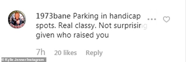 لاحظ رواد مواقع التواصل أن صاحبة امبراطورية Kylie Cosmetic قد ركنت سيارتها في موقف خاص لذوي الاحتياجات الخاصة، حيث تظهر اللافتة الزرقاء التي تمنع أي فرد من غير ذوي الاحتياجات ركن سيارتهم في المكان، فكتب أحدهم: "إنها لجريمة أن تركن سيارتك في مكان مخصص لذوي الاحتياجات الخاصة."