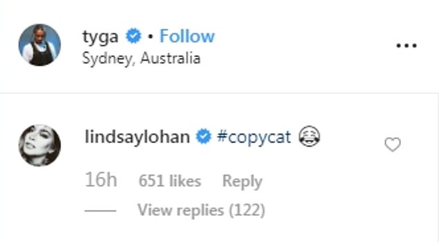 وعلى الفور أرفقت "ليندسي لوهان" تعليقًا قالت فيه: "مُقلِّد"، إلى جانب إيموجي لوجه يضحك، وحظي تعليقها بأكثر من 700 إعجاب، لكنها لم تحصل على رد من "تيجا" نفسه.