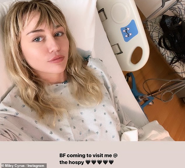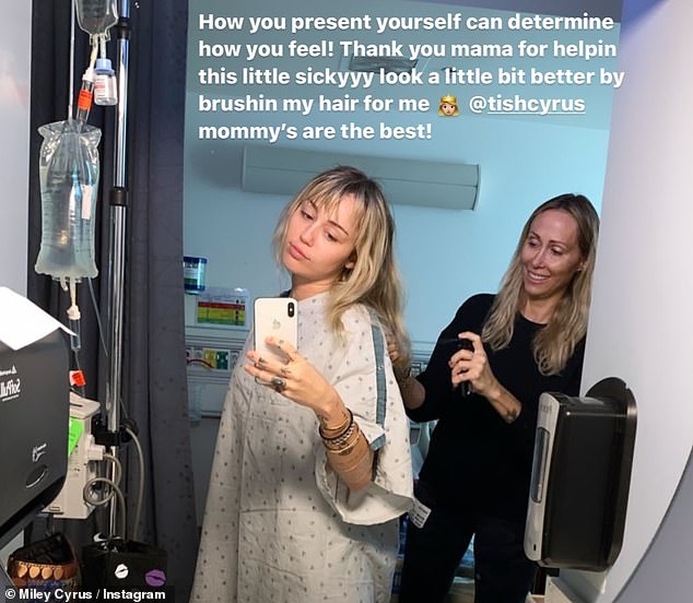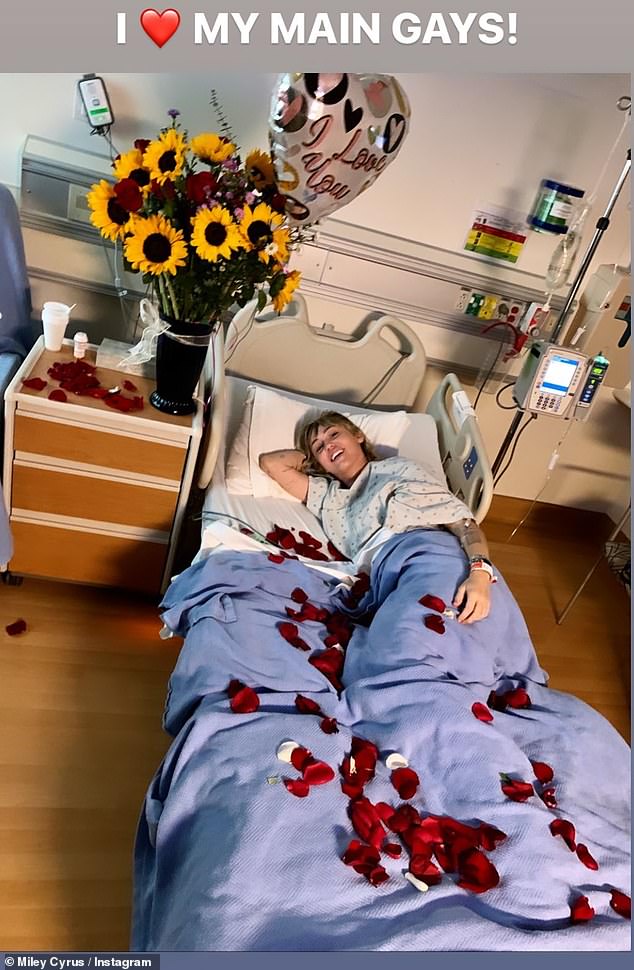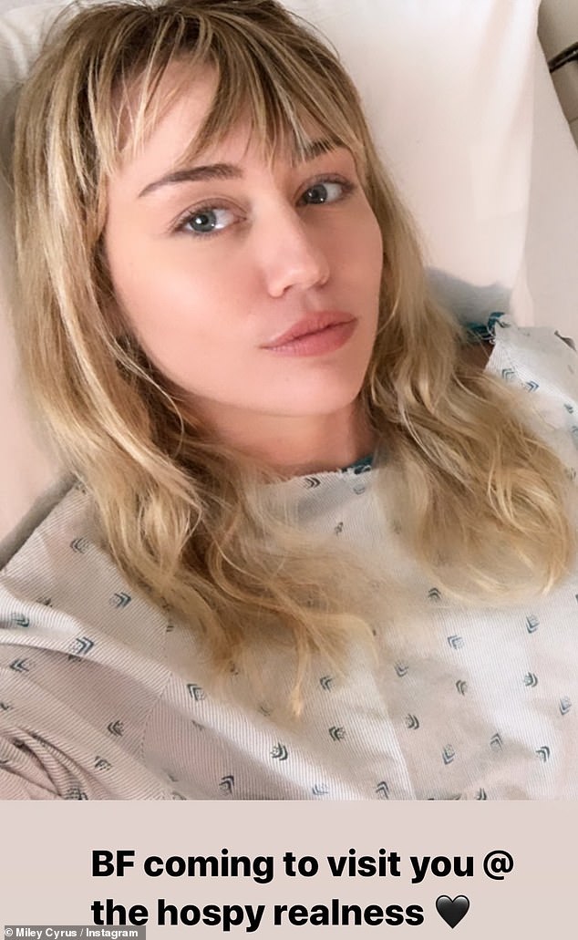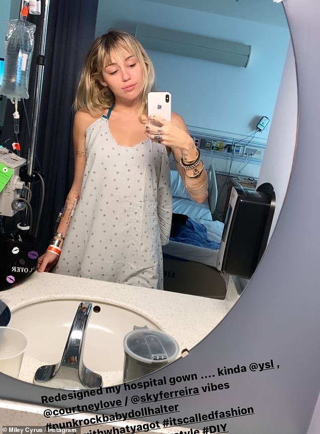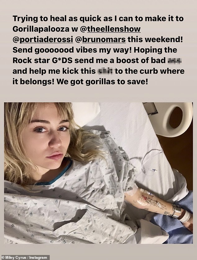 وشاركت "مايلي سايرس" (26 عامًا) متابعيها عبر موقع "إنستغرام" صورة لها من داخل المشفى مُرتديةً ملابس المرضى وموصول بذراعها عدة أنابيب مُغذي، وكتبت: "أحاول التشافي بسرعة كي أتمكن من المشاركة في عرض "Gorillapalooza" هذا الأسبوع."