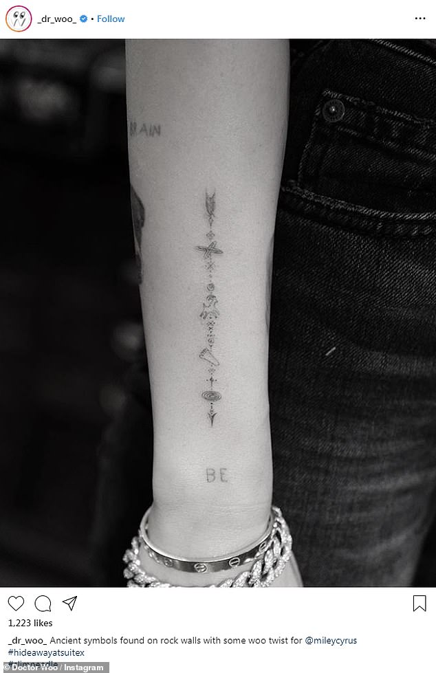 وتزامنًا مع ذلك، نشر رسام الوشوم الشهير "دكتور أوو" صورة لوشم "مايلي" الجديد الذي اعتمدته في الجهة الداخلية لذراعها، وتنطوي فكرته على رموز قديمة وجدت على أحد الجدران الصخرية، ومع قليل من الابتكار والإبداع انتهى الشكل كما في الصورة.