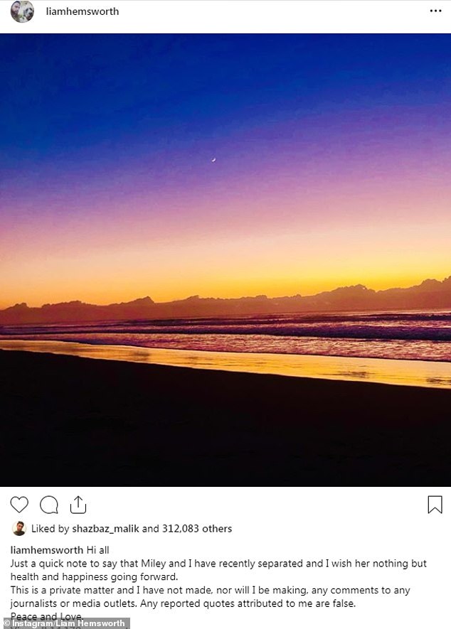 وخلال وقت سابق، خرج "ليام" عن صمته حول الانفصال، ونشر صورةً عبر "إنستغرام" لشاطىء عند غروب الشمس، وأرفقها بتعليق، جاء فيه: "أهلاً بالجميع، مجرّد ملاحظة سريعة، أنا ومايلي انفصلنا مؤخراً، وأتمنى لها السعادة والصحة.. السلام والحب".