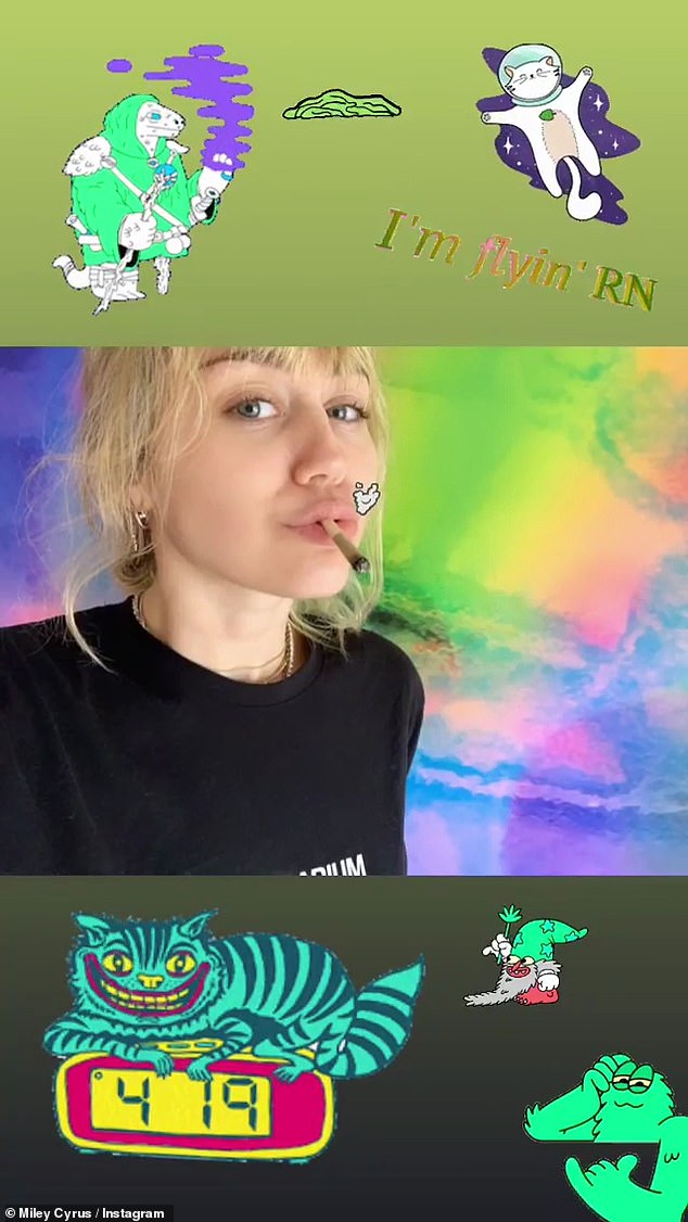 واحتفلت مايلي باليوم الكبير من خلال نشر سلسلة من الصور عبر حسابها الخاص على "إنستغرام"، حيث ظهرت في صورة وهي تشعل سيجارة كبيرة وعلّقت بتاريخ المُناسبة "20/4"، أما في صورة أخرى فكانت تدخن واحدة أخرى أصغر حجماً.