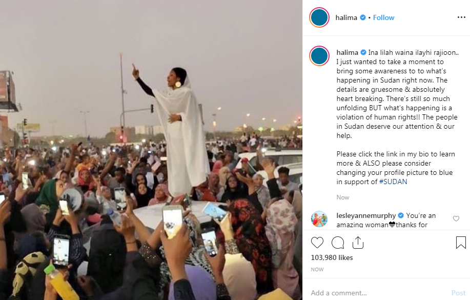 نشرت عارضة الأزياء الأمريكية ذات الأصول النيجيرية منشورًأ عبر حسابها على مواقع التواصل الاجتماعي لسيدة سودانية تقف وسط حشود نسائية، جاء فيه: "إن لله وإنا إليه راجعون، أردت فقط أن أقف لحظة لنشر الوعي لما يحدث في السودان الآن.. التفاصيل شنيعة وتفطر القلب، ولا يزال هناك الكثير ليتكشف، لكن ما يحدث هو انتهاك لحقوق الإنسان، يستحق الشعب السوداني اهتمامنا ومساعدتنا."