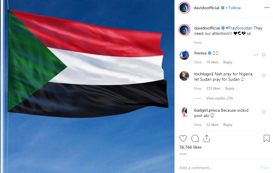 نشر المغني النيجيري علم السودان، وعلَّق: " أرسلوا صلواتكم للسودان، فهي تحتاج اهتمامنا."
