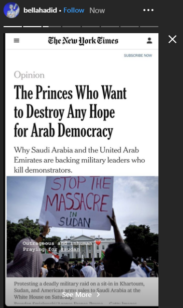 نشرت عارضة الأزياء الأمريكية ذات الأصول الفلسطينية صورة لمقال منشور على موقع "نيويورك تايمز" تحت عنوان "محاولة الأمير تدمير أي أمل للديموقراطية العربية".