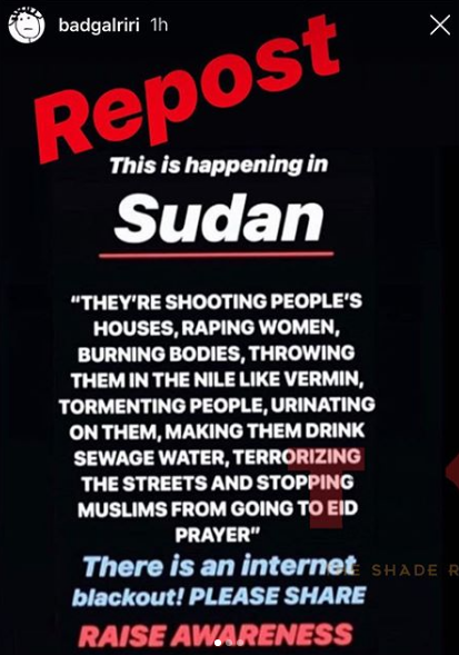نشرت المغنية البربادوسية "ريهانا" سلسلة منشورات عبر حسابها على موقع "إنستغرام" مُعاد مشاركتها من صفحات أخرى، جاء في أول منشور: "إنهم يطلقون النيران على منازل الأبرياء، يغتصبون النساء، ويحرقون الأفراد، ويرمون أجسادهم في النيل كأنهم حشرات طفيلية، ويخفونهم، ويتبولون عليهم، ويجبرونهم على شرب مياه المجاري، ويروعون المارة، ويمنعون المسلمين من أداء صلاة العيد."