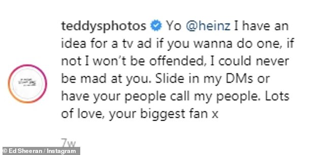 وفق ما نقله موقع "ديلي ميل" البريطاني، توسَّل "إيد شيران" شركة "هينز" على العمل معه الشهر الماضي، حيث قدَّم خدماته الترويجية لإجراء إعلانٍ لهم، فنشر تعليقًا على أحد منشورات الشركة موضحًا أن لديه فكرة لفيديو إعلاني خاص بهم، وقد وافقت الشركة على ذلك ومنحته 300 ألف جنيه استرليني.