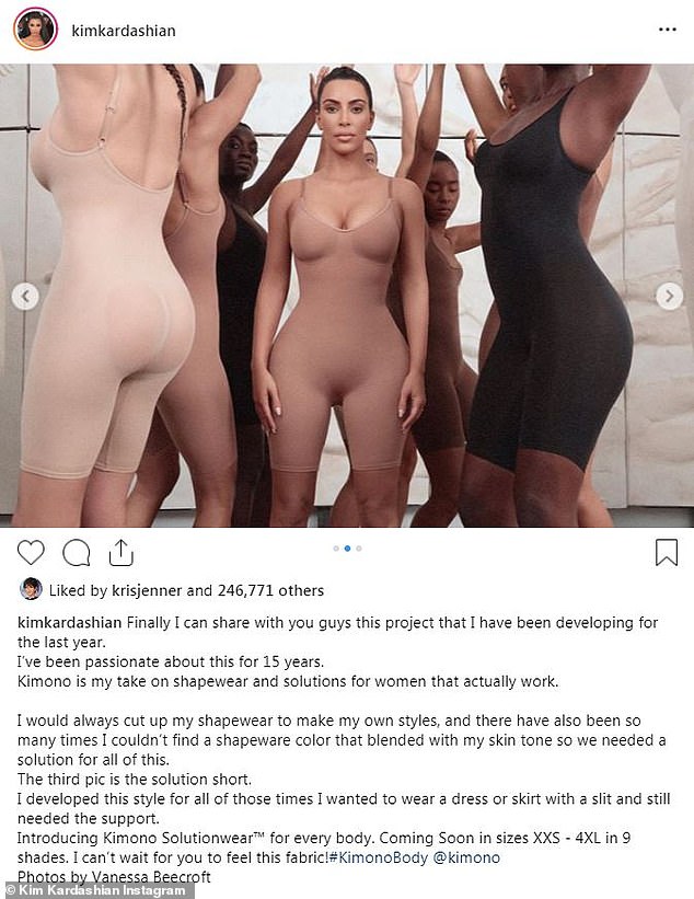 وأضافت كيم تعليقاً مطولاً للحديث عن مشروعها الجديد، بجانب الصور المعروضة، حيث قالت: "أخيراً يمكنني أن أشارككم هذا المشروع، الذي كنت أعمل عليه خلال العام الماضي، لقد كنت شغوفة بهذا الأمر لمدة طويلة، فمجموعتي كيمونو، هي مكان الملابس الداخلية وحلول للعديد من النساء".